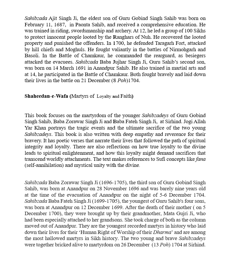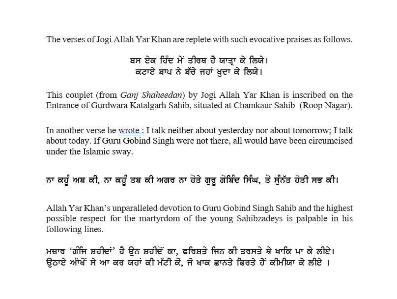 When both Sahibzadeys were bricked alive, Mata Gujari ji thanked Akaal Purakh for giving them a dignified death. She breathed her last while meditating. Later, Diwan Todar Mal cremated them by purchasing the most expensive land in the world. There Gurdwara Jyoti Sarup Sahib was built later in their memory. Unparallel services were rendered by both Baba Moti Ram Mehra ji and Diwan Todar Mal ji and their families. There also stands Gurdwara Thanda Burj, where she spent the last three days of her life. Every year, devotees come to pay homage to courageous Mata Gujar Kaur ji and her two younger grandsons in the last week of December. Brave Mata Gujar Kaur ji kept the tradition of Sikhi alive, without any complaint. She proved a real steel hearted lady, the like of whom shall never be born again. The life history of this unforgettable brave lady is a lighthouse for the generations to come. Due to her teachings and upbringing, her two young grandsons set an example for others to follow, particularly for the young Sikhs of today.